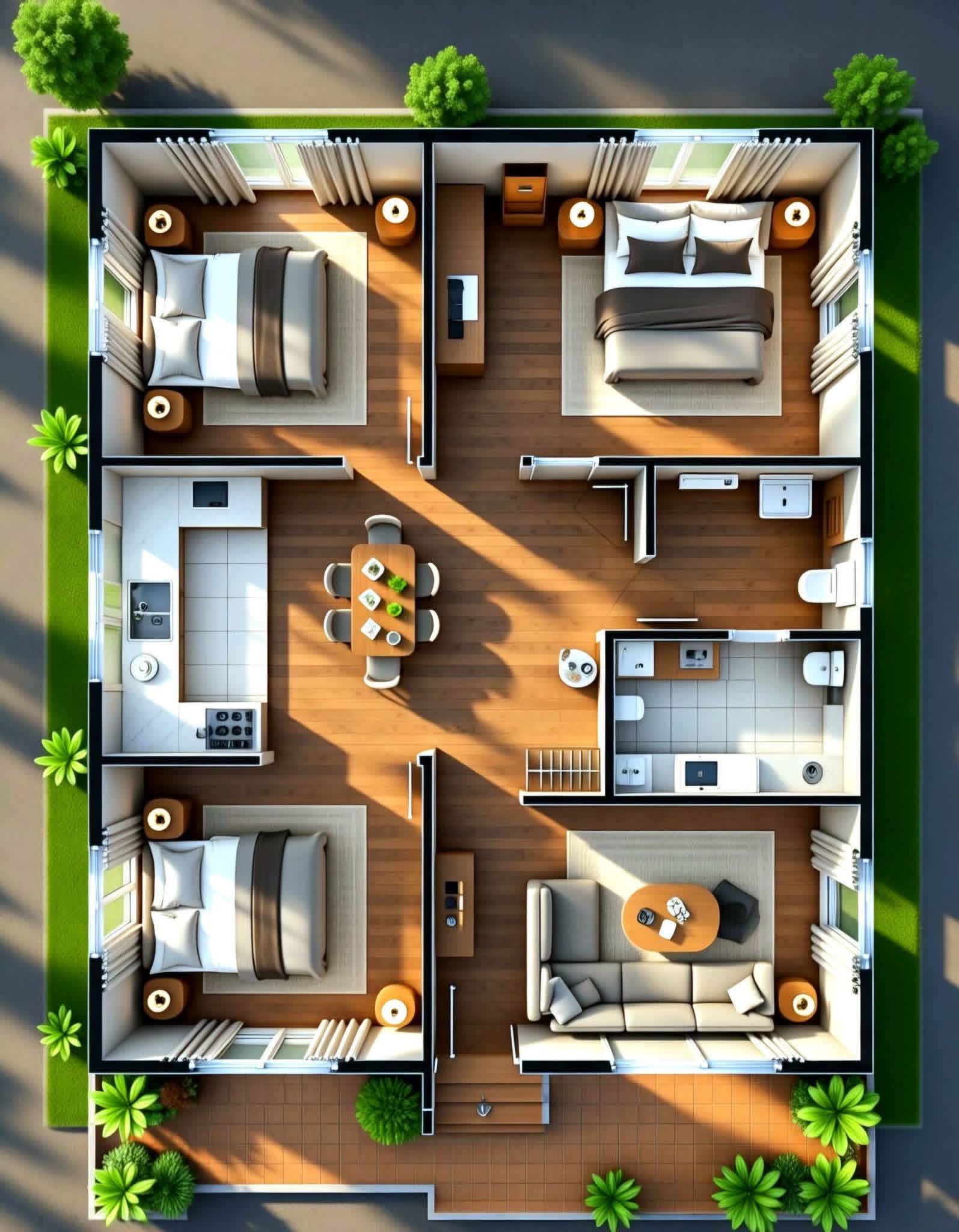 This modern 4 bedroom house plan features a well-organized and spacious layout designed for comfortable family living. The floor plan includes four well-sized bedrooms, a central dining area, a functional kitchen, and a cozy living area positioned near the staircase. Two toilets are conveniently placed for easy access, making the design practical for daily use. … Read more