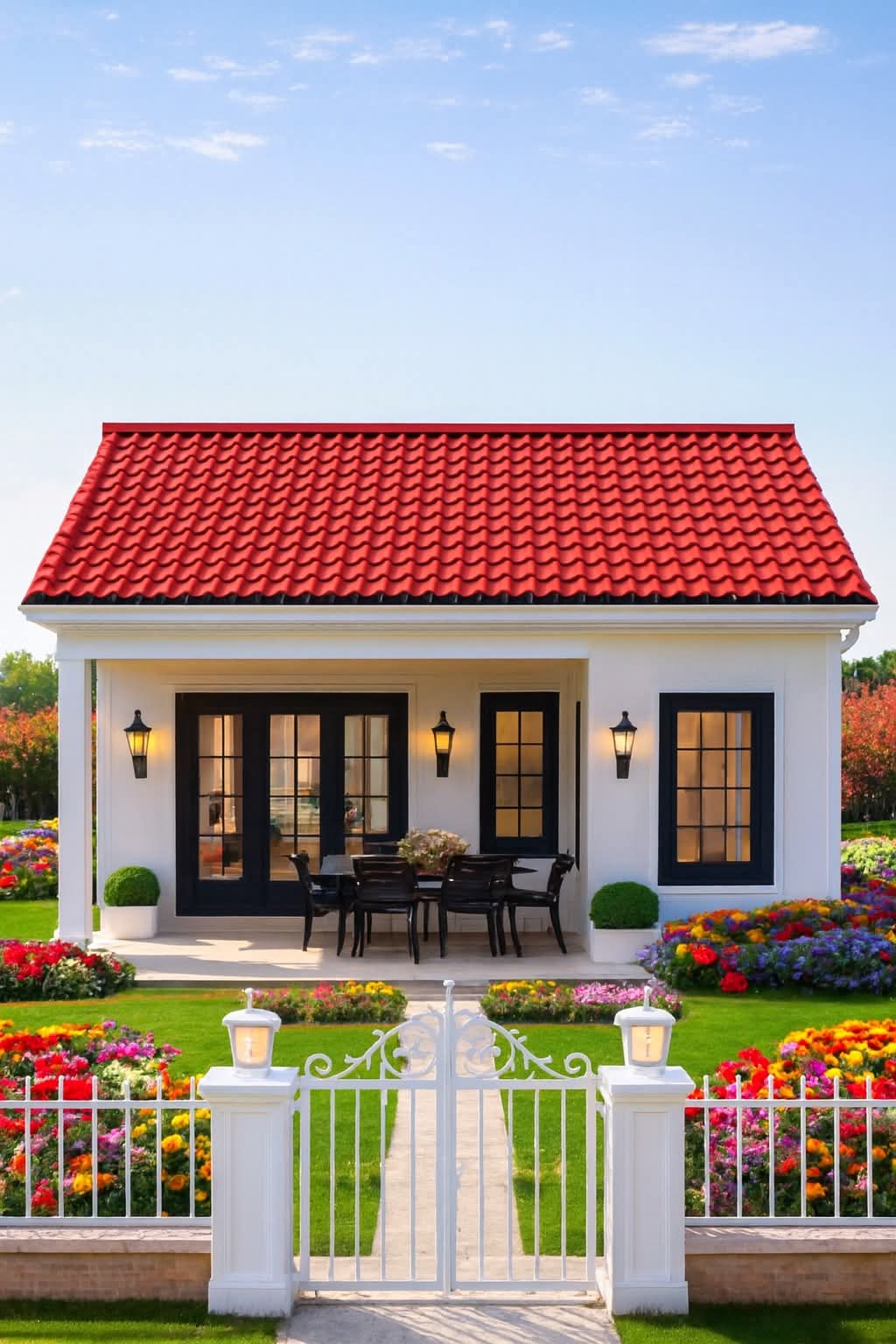 This beautiful modern cottage-style home combines simplicity, comfort, and timeless design in one compact layout. Featuring a welcoming front veranda, classic pitched red roof, and large glass doors, this house creates a warm first impression while maintaining a clean contemporary look.