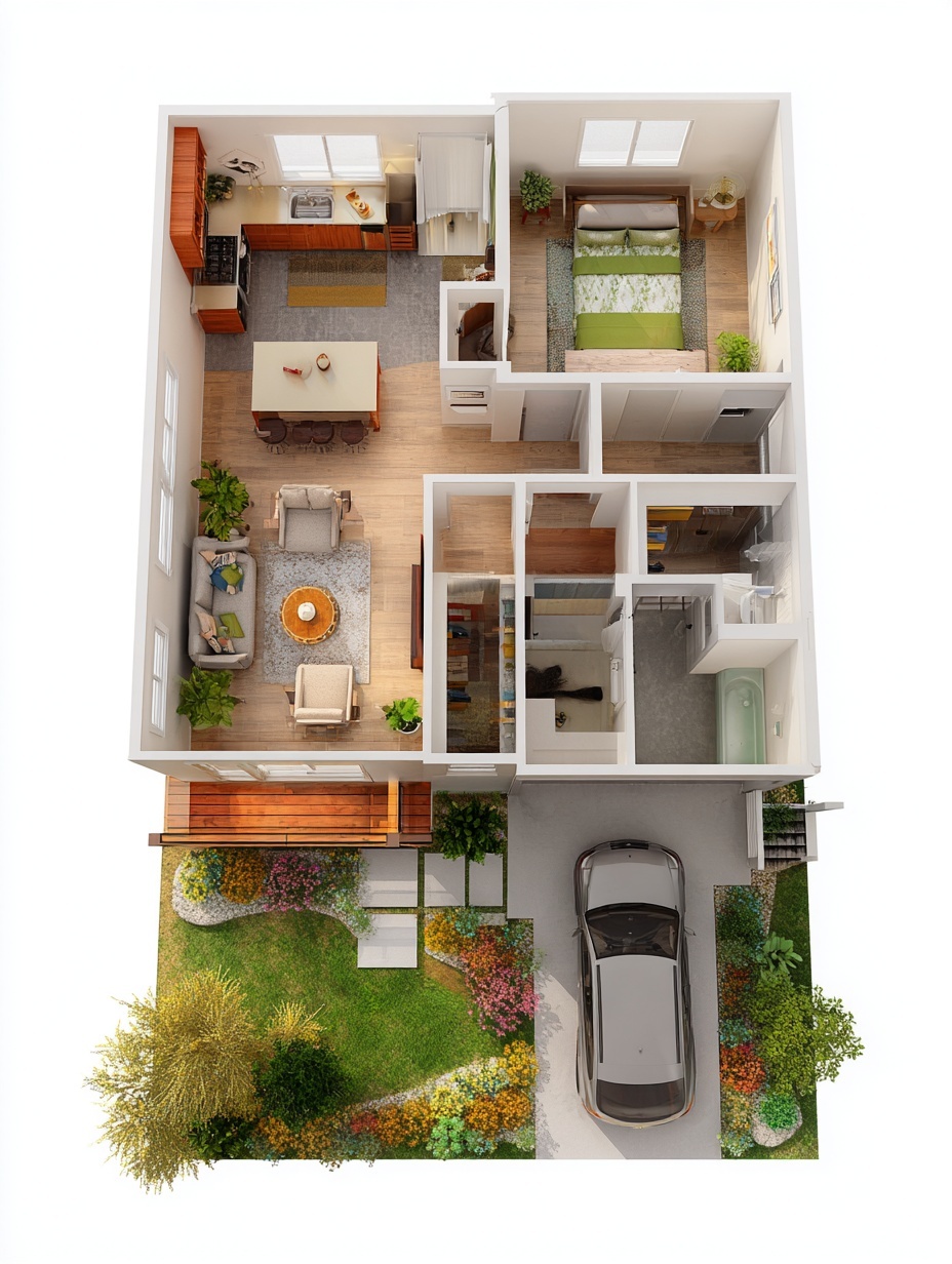 This modern 1 bedroom house floor plan features a bright open-plan living and dining area, a stylish kitchen with central island, and a spacious master bedroom with nearby bathroom. The layout also includes a dedicated laundry area, practical storage spaces, a single car parking zone, and a cozy front porch with landscaped garden. Designed for smart space efficiency and everyday comfort, this compact home is ideal for singles, couples, or rental investment, combining contemporary interior design with functional modern living.