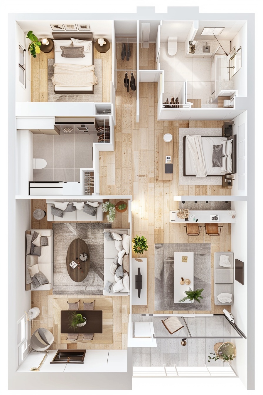 This modern 2 bedroom house plan features a smart, space-efficient layout designed for comfortable everyday living. The design includes a bright open-concept living room, a cozy dining area, and a functional kitchen with clean modern finishes. Both bedrooms are well-positioned for privacy, with the master bedroom offering generous space and built-in storage. The bathroom is centrally located for easy access, while the overall floor plan highlights natural light, warm wooden flooring, and contemporary furniture styling. Ideal for small families, couples, or first-time homeowners, this compact yet elegant 3D floor plan delivers a perfect balance of practicality and modern design—making it a great inspiration for affordable contemporary homes or compact urban living.