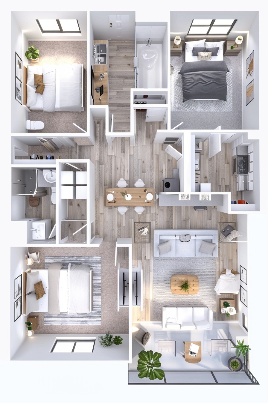 This 3 bedroom apartment design is perfect for anyone looking for a practical yet stylish home layout, combining modern architecture with efficient use of space.
