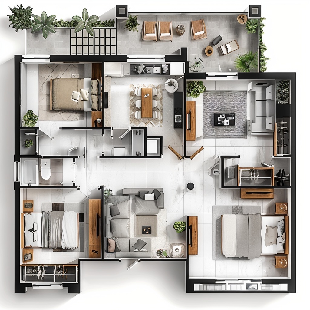 A stylish modern 3-bedroom house plan featuring a spacious open-concept living and dining area, contemporary kitchen, two well-placed bathrooms, and a relaxing outdoor patio. This thoughtfully designed layout offers a comfortable master bedroom plus two additional bedrooms, perfect for family living. Ideal for small to medium plots, this floor plan combines smart space planning, natural light, and modern finishes—making it a great choice for affordable, elegant home construction.