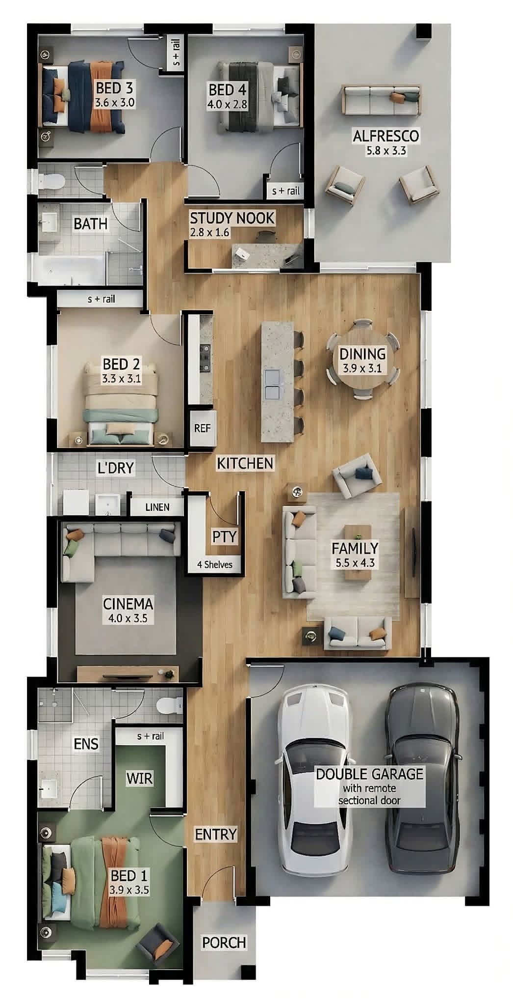 This spacious modern 4 bedroom house floor plan is thoughtfully designed for comfortable family living and entertaining. The layout features a private master bedroom with walk-in robe and ensuite, three additional well-sized bedrooms, a shared bathroom, and a convenient study nook ideal for home office or school work. At the heart of the home is an open-plan kitchen, dining, and family living area that flows seamlessly to a covered alfresco space, perfect for outdoor relaxation. Extra highlights include a dedicated cinema room, walk-in pantry, laundry with linen storage, and a secure double garage with internal access. A practical yet stylish design, ideal for growing families who want space, functionality, and modern comfort in one complete home.