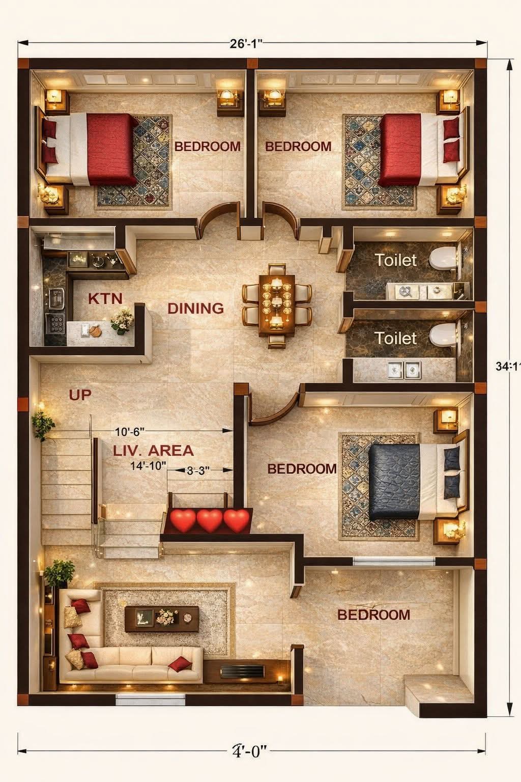 This modern 4 bedroom house plan features a well-organized and spacious layout designed for comfortable family living. The floor plan includes four well-sized bedrooms, a central dining area, a functional kitchen, and a cozy living area positioned near the staircase. Two toilets are conveniently placed for easy access, making the design practical for daily use. With clear circulation, balanced room spacing, and an efficient indoor layout, this house plan is ideal for families seeking a compact yet comfortable modern home design suitable for urban or suburban living.