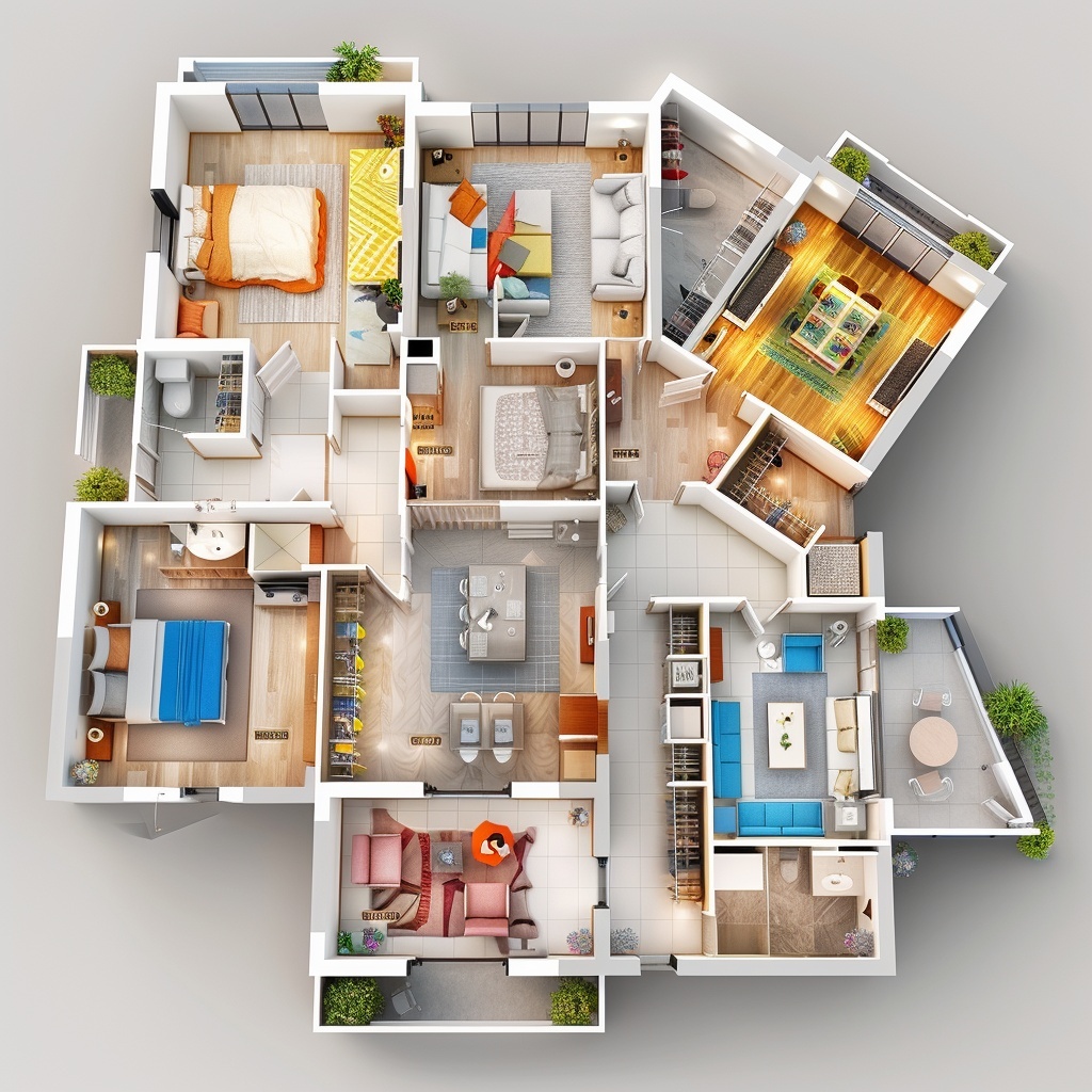 - Discover this beautifully designed luxury 4 bedroom house plan featuring a smart open-concept layout that blends comfort, functionality, and modern style. This 3D floor plan showcases a spacious living room, elegant dining area, and a contemporary kitchen with ample storage and preparation space—perfect for family living and entertaining guests.