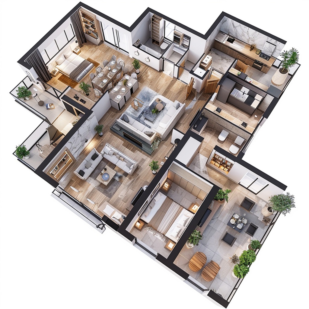 Each bedroom is carefully arranged to provide privacy and comfort, including a well-designed master bedroom that offers a peaceful retreat after a long day. Additional bedrooms are spacious enough for family members or guests, while the bathrooms are strategically placed to ensure easy access from all areas of the home.